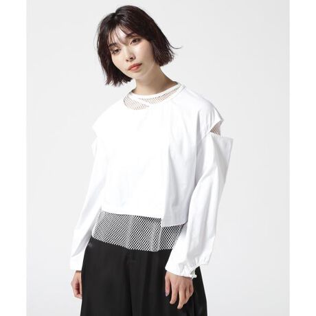 表着用:クロップド丈長袖Tシャツの襟ぐりや裾からメッシュが出るレイヤードスタイルに。長袖のスリットからメッシュが覗くのも拘りポイント。