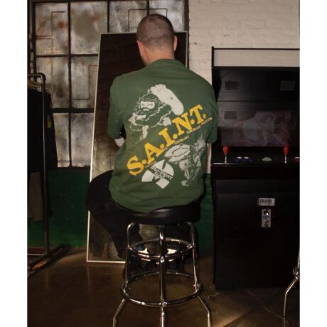 SAINT MICHAEL製品は製造過程上、様々な加工を施しております。色落ち、色ムラ、軽微な穴などが見られますが、こちらは製品不良ではなく特質になっております。お届けする商品につきまして商品画像とは異なる部分(色味、スレ具合)、小さな穴、ダメージや汚れ、またプリントのひび割れもある事をご理解下さいませ。