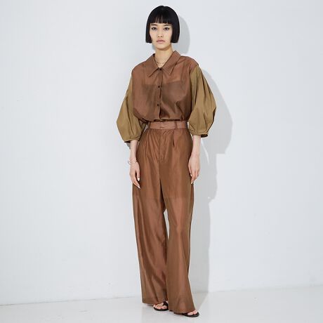身頃にシアー素材、袖にシャツ地を使った異素材コンビデザインが目を引くシャツ。袖にはタックを施してボリューム感をプラス。シアー素材ながら裏地付きで透けないから、一枚で安心して着られます。光沢感のある上品な素材が、エレガントな印象を演出。