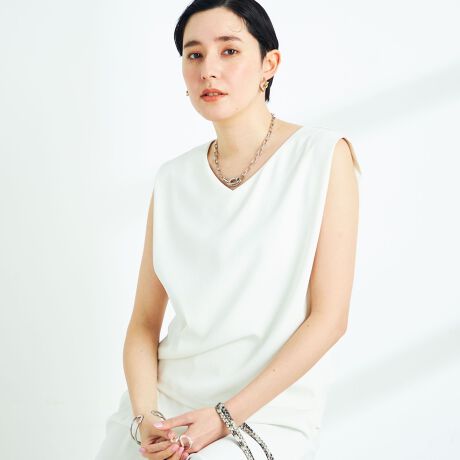 ・梳毛調合繊素材を使用したVネック・肩タック入りノースリーブブラウス