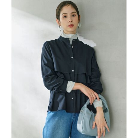 大胆なボリュームのフリルなので甘くなりすぎないように、全体のシルエットや襟や袖の形状など、少しだけモードな要素を取り入れています。下の段のフリルはインできるようになっており、インするとスカートとのスタイリングがしやすくなるデザインに仕上げた一枚。程よく首周りにゆとりを持たせ、すっきりとした印象に。1枚でも羽織りでも、着こなしが広がります。スタイリングによって綺麗めからカジュアルまで雰囲気をかえられる万能ブラウスです。