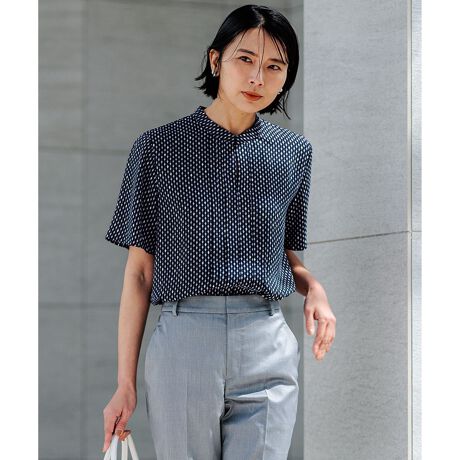 襟元にあるホックを開けても閉めてもサマになる、さらりと着て頂ける一枚です。プリントのダイヤモチーフにはアクセントカラーを散りばめているので、ジャケットを羽織った際にも着映えます。同素材のスカートと合わせてワンピース風に着ていただくのもおすすめです。温かみのあるベージュ(#535)と、ドラマティックな印象のネイビー(#575)の2色展開です。