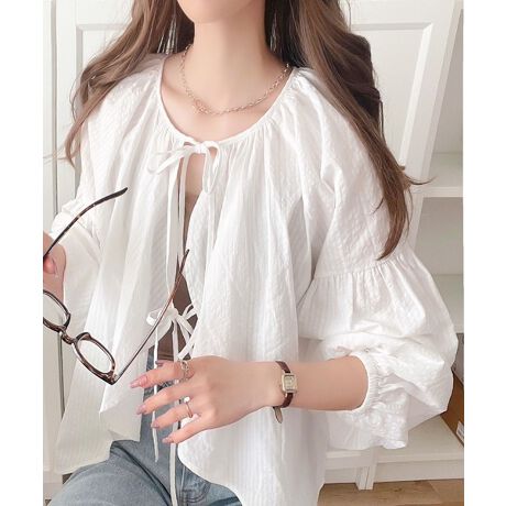 サッカー素材でトレンド感。綿100%前後2wayショート丈リボンカーディガンブラウス