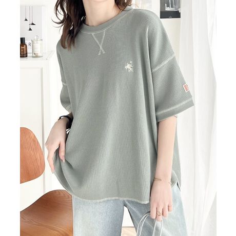 胸元のワンポイント刺繍が可愛いワッフル半袖トップス。