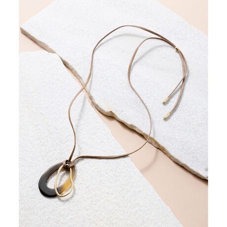 トップには天然素材である水牛角を使用し、オーバル型のホーンとメタルを重ね合わせたワントップネックレスです。天然素材特有の柄の出方がニュアンス感を演出。紐仕様のため自由に長さを調節でき、様々なアレンジをお楽しみいただけます。