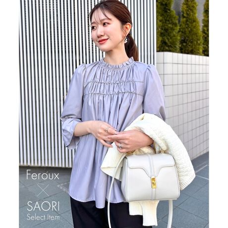 シャーリングのデザインがフェミニンな印象のブラウス