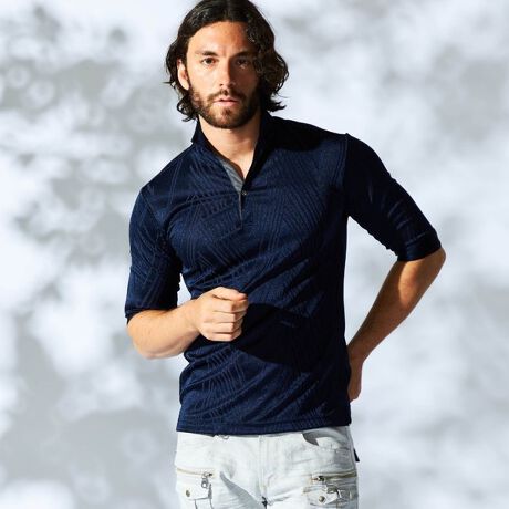 光沢の強い大きなヘリンボン柄のジャカードカットソー素材を使用。