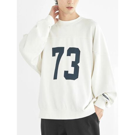 フロントの大胆なナンバリングプリントと、袖口の刺しゅうがコーデのアクセントに。