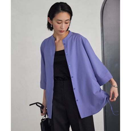 ■デザインサイドの裾部分にドローストリングデザインを効かせたバンドカラーシャツです。ドローストリング部分はあらかじめギャザーが寄っているので、分量が調整しやすいのも嬉しいポイントです。