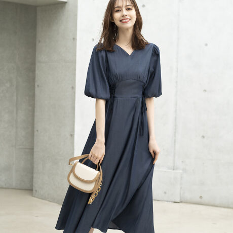 サイドレースアップを施した、コルセット風デザインが可愛いワンピース。ぽわんとしたボリューム感のあるスリーブは甘さをプラスしつつ、気になる二の腕もさりげなくカバーしてくれます。1着でも大人レディな着こなしに決まる、ワードローブに是非取り入れたいアイテムです。
