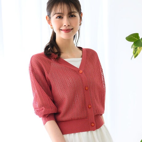 【マルイ売上ランキング 6位 獲得実績!】透かし柄で軽やかな印象に仕上げたVネックカーディガン。ほんのりとした透け感がトレンドライクな着こなしを演出。クロップド丈もスタイリングにヌケ感をプラスしてくれます。さっと羽織るだけでも、こなれた着こなしに決まるアイテムです。