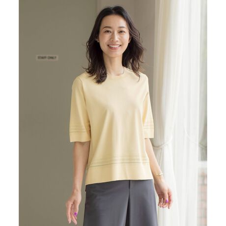 袖口、裾に編み柄を取り入れた、5分袖のニット。ボディは程よくゆとりのあるサイズ感ながら、肩まわりはすっきりとさせています。裾の脇にスリットを入れた、ボディラインを拾わないシルエットが魅力です。着丈に前後差を出して、パンツにもスカートにも合わせやすく仕上げました。気になる二の腕を隠してくれる袖丈で、初夏はもちろん、真夏から初秋まで長く着られるさらりとした着心地です。同素材のカーディガンとのアンサンブルはもちろん、1枚でも使える優秀アイテムでコーディネートの幅がグッと広がります。カラーは、ニュアンスカラーのグレージュ(#003)、華やかで目を惹くイエロー(#040)、コーディネートのポイントになるダルブルー(#074)、通勤にも使いやすいネイビー(#075)の4色で展開します。