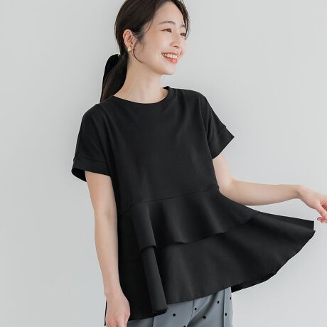妊娠後期でも着られるトップスを探し、こちらを購入しました。フリル部分は位置が高めにあり、素材にハリ感があるため、お腹の膨らみがあまり目立ちません。