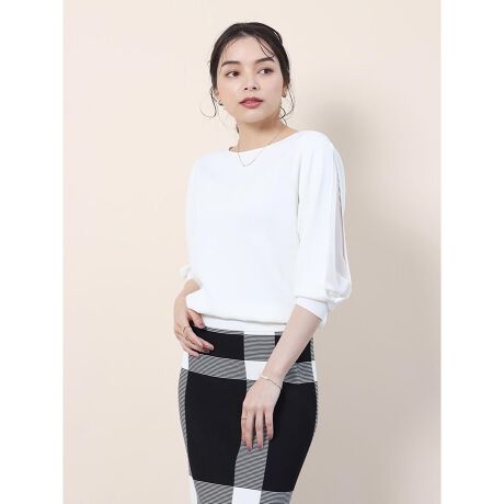 アームスリットからチラリと覗く異素材ドッキングデザインが可愛らしいニット新作登場。