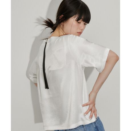 滑らかなタッチとナチュラルなシワ加工が魅力のサテンTEE。きれいめの素材ながら、あえてしっかりとした太めの編み立てリブ襟や、後ろあきの金属ファスナーでコンサバになり過ぎないモードさのあるデザイン。ドロップショルダーでリラックス感のあるサイジング。1枚で着るだけでこなれ感が出る、シンプルなら細部にこだわった、大人のカジュアルスタイルに活躍する1枚。