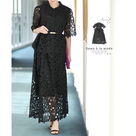 ふわっとペプラムの総レースセットアップ。ペプラムシルエットのトップスとロングスカートの2点セット。繊細なレースの透け感で品の良い肌見せを楽しめます。くびれメイクしてくれるペプラムや女性らしいAラインシルエットなど拘りがたくさん。セットでも別々でも楽しめる万能なレースセットアップです。