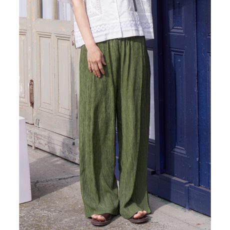 プリーツのような生地感が特徴の、さらっと着やすいワイドパンツ。