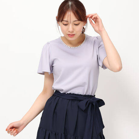 ネックのパールトリミングで、アクセいらずの華やかさを演出してくれるTシャツ。ややボリューム感のある袖もスタイリングに愛らしい印象を与えてくれます。洗練感のある大人可愛いデザインで、オンオフ問わずに活躍してくれるアイテムです。