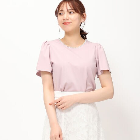 ネックのパールトリミングで、アクセいらずの華やかさを演出してくれるTシャツ。ややボリューム感のある袖もスタイリングに愛らしい印象を与えてくれます。洗練感のある大人可愛いデザインで、オンオフ問わずに活躍してくれるアイテムです。