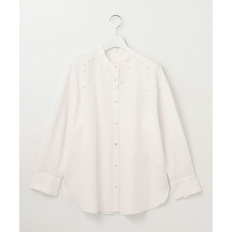 お顔周りの繊細で華やかな刺繍が上品なバンドカラーシャツ■デザイン前身頃のお顔周りから肩につながるようにカットワークを施した刺繍を入れたバンドカラーのシャツブラウスです。アームホールを大きめにしたドロップショルダーデザインが肩周りにゆとりを生み、シンプルながらに女性らしさと抜け感を感じる1着です。前を閉めて着て頂くのはもちろん、前を開けてシャツアウターとしても活躍します。■素材テンセルとコットンの混紡糸を高密度に織り上げた、しわになりにくい素材です。毛羽を取り、加工を施すことで生地をしっかりとさせ、柔らかい風合いに仕上げています。程よい光沢感があり、上品できれいめな印象です。■同素材アイテムジャケット(JKW7CM0407)プルオーバーブラウス(BLW7CM0408)