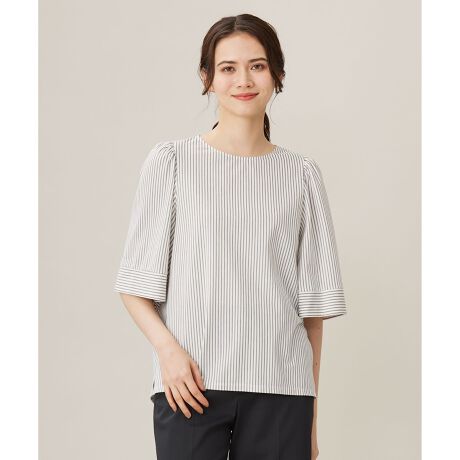 爽やかなストライプ柄の着映えカットソー■デザイン爽やかなストライプ柄のカットソーです。フレアスリーブのふんわりとした袖デザインと5分袖が、気になる二の腕周りをカバーしてくれます。ストライプの柄を活かし、袖口はボーダーにすることでデザインポイントにしています。身頃はコンパクトなボックスシルエットなので、ボトムを選ばず着て頂けます。■素材吸湿性が良く、保湿性と放湿性のバランスが取れたリヨセルと綿の混紡糸を使用しております。毛羽を極限まで押さえてすっきりと仕上げています。汗をかいても肌離れしやすいよう、ブランドオリジナルでツイスト編みで仕上げています。吸汗性、速乾性、遮熱性を高め、春夏に適した風合いと適度なドレープ性を醸し出しています。