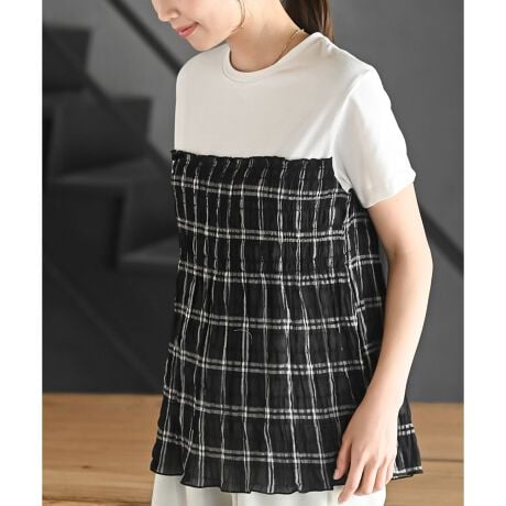 Tシャツにビスチェを重ねたようなレイヤードが楽しめる1枚です。