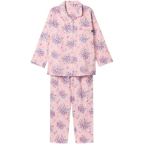 【パジャマ(ロング袖ロングパンツ)】1793年に誕生以来、代表される「ハドンホール」柄を始め、多くのコレクションを世に送り出し続けている「ミントン」。その気品あふれる美しい柄を使用したパジャマ。・本体に、細番手の綿100%のサテンを使用。・なめらかな肌ざわりとソフトな光沢感を持ち、繊細さや軽さ、透明感をあわせもつ美しいデザイン・葉のモチーフの地模様に〈ハドンホール〉の華やかな大ぶりのブーケを組み合わせて、ブーケがふわりと舞っているように描いた、奥行き感のある表情・ハマカラーの下襟にボタンループがあるので、好みに合わせて開閉でき、二通りのデザインが楽しめる※〈ハドンホール〉1948年にデザインされ、発売以来、世界中で愛されているロングセラーの図柄。パッションフラワー、パンジー、カーネーションなどが図案化され、東洋的なエキゾチシズムが感じられるデザイン[資料元:(株)川島織物セルコン]【サイズ詳細】S:身幅49.0cm 着丈67.0cm 身丈69.5cm 肩幅45.0cm 袖丈51.5cm ボトム脇丈95.0cm 裾まわり39.0cm ウエスト53.0cm ヒップ104.0cm 股下(レングス)66.5cmM:身幅53.0cm 着丈67.0cm 身丈69.5cm 肩幅46.0cm 袖丈52.0cm ボトム脇丈95.0cm 裾まわり41.0cm ウエスト58.0cm ヒップ107.5cm 股下(レングス)66.0cmL:身幅57.0cm 着丈67.0cm 身丈69.5cm 肩幅48.0cm 袖丈52.0cm ボトム脇丈95.5cm 裾まわり43.0cm ウエスト63.0cm ヒップ111.5cm 股下(レングス)66.0cmLL:身幅61.0cm 着丈68.0cm 身丈70.5cm 肩幅49.0cm 袖丈52.5cm ボトム脇丈96.0cm 裾まわり46.0cm ウエスト68.0cm ヒップ116.5cm 股下(レングス)66.5cm※出来上がり寸法を表示しております※アイテムによって柄の出方が異なりますのでご了承ください。