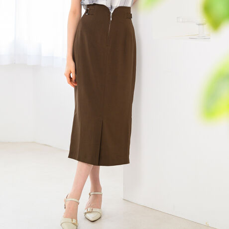 カーブを描くウエストデザインがポイントになったフロントジップスカート。<br>タイトなIラインシルエットで、スマートな大人の装いを演出。ウエストサイドのベルト飾りもアクセントをプラスしてくれます。トップスをタックインすることでデザインも引き立ち、脚長効果も期待できる嬉しいアイテムです。