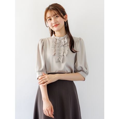 少々ゆとりあるスタンドネックに大振り過ぎないフリルを入れることで