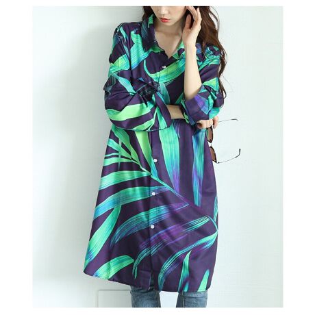 【チュニック】 トップス ブラウス シャツ 緑 グリーン 長袖 ボタニカル柄 膝丈 リーフ Aライン