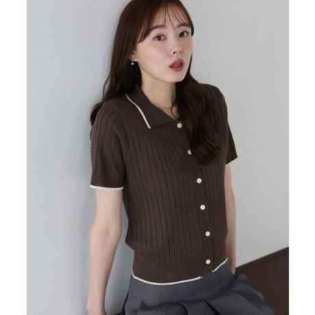 ネックと裾、袖口の配色でアクセントを加えたサマーニットトップス。