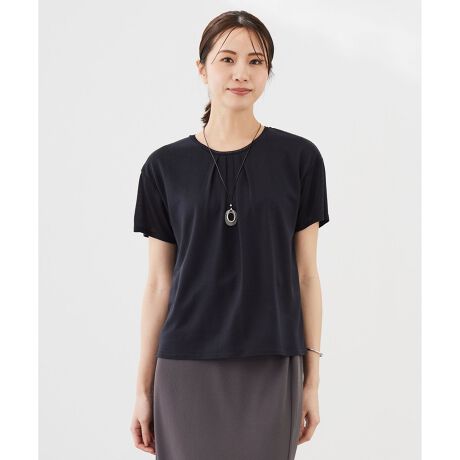 襟にニットパーツを施して、襟元にタックを入れたフェミニンなカットソー。シアー感のある素材ですが、さらっとした裏地と2枚重ねしていて、透けも気になりません。同素材のカーディガンと合わせて、アンサンブルとしても着用いただけます。カラーは、明るく柔らかな印象のライトグレー(#003)、肌なじみの良いベージュ(#033)、爽やかなアクセントになるサックスブルー(#073)、洗練された雰囲気のダルブルー(#074)、ベーシックなネイビー(#075)の5色展開です。