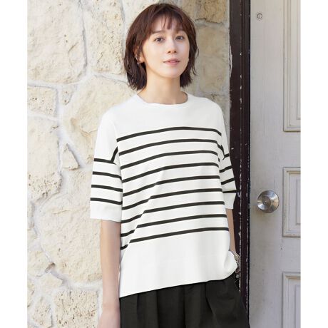 接触冷感・UVカット機能付き!女性らしいTシャツライクニット■デザイン美しいドレープ感のあるキレイめなTシャツライクニットです。程よくゆとりのあるシルエットですが、落ち感のある素材なのでラフな印象になりすぎないデザイン。ジャケットやニットを羽織ってもストレスを感じにくく、ブラウスのようにきちんと感もあるのでインナーとしても最適です。着丈に前後差があるのでパンツスタイルにも合わせやすく、シーンを問わず活躍する汎用性の高いトップスです。オフ×ブラックボーダー(101)はWEB限定カラーになります。オフ×ネイビー(202)はネイビー部分、シナモン×オフ(234)はオフ部分にラメが入っております。■素材レーヨンとストレッチポリエステルを撚糸した糸を使用しております。ストレッチ性があるので動きやすく、身体に馴染みやすいのでストレスフリーな着心地です。撚りを強くかけているので、表面がクレープ状になっており、ドライタッチなシャリ感と清涼感がありながら、エレガントなドレープ性を合わせ持った素材です。接触冷感、UVカット機能付きです。※オフホワイト(002)カラーは生産時期により漂白剤が使用可の場合がございます。■同アイテムの他のカラープルオーバー ニット(KRWMCM0452)