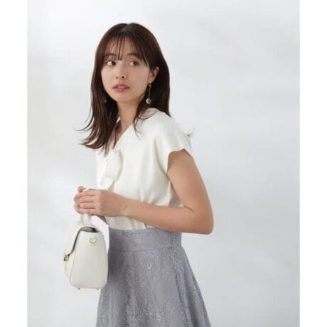 【商品特徴】ボトムスを選ばずコーディネートしやすい、上品リボンボウタイニットです。Vネックで抜け感を出し、お顔まわりを華やかに見せてくれるリボンボウタイがアクセント。袖は肩まわりを覆ってくれるフレンチスリーブなので、肌が出すぎず一枚で着やすくなってます。【スタイリング】マーメイドスカート、フレアスカート合わせで、大人フェミニンな通勤コーデが完成します。デニムパンツ合わせで、オフカジュアルにも着まわせます。