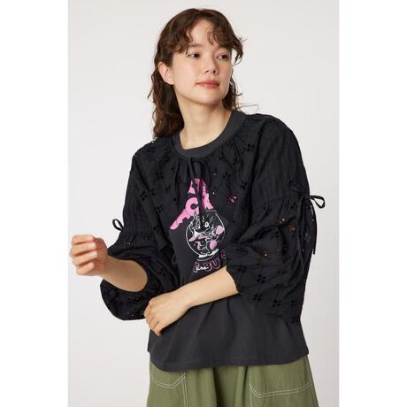 [型番:420HSD30-1591]柄違いのコットンエンブロイダリーレースを使用したボレロ。袖に通したリボンでシルエットを調整できます。ワイドボトムとの相性も抜群です。