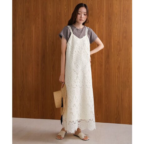 クラシックな柄が魅力的な総レースのキャミソールワンピースです。すとんと落ち感のいいシルエットで上品な雰囲気でお召し頂けます。華奢見えするダブルのリボンストラップは背中側で結んでいただき、自由に着丈を調整できる仕様に。アクセントのくるみボタンも相まったバックシャンに、裾は美しいレースのカットを生かしたスカラップになっており、360度どこから見ても楽しめる抜かりのないデザインです。