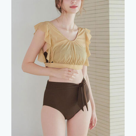 ・ショルダーフリルのシアートップス付きの3点セットビキニ。