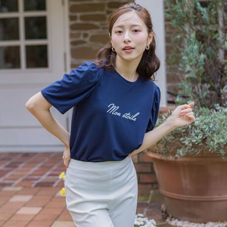 パフ袖と華奢な筆記体ロゴがフェミニンムードを表現するロゴTです。