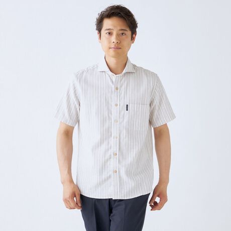 【半袖】リネン混 カッタウェイシャツ ストライプ ブラウン ウォッシャブル 洗える ビジカジ