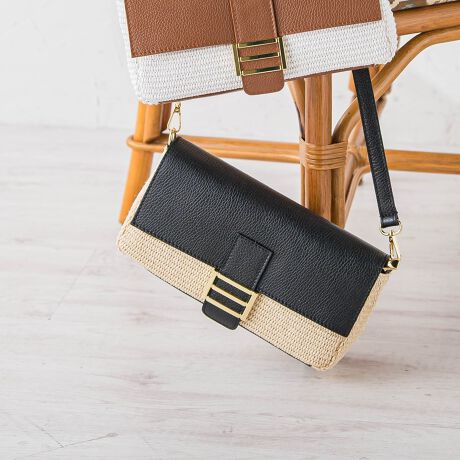 レザーのフラップの重工さとラフィアの夏らしい涼し気さが融合しております。