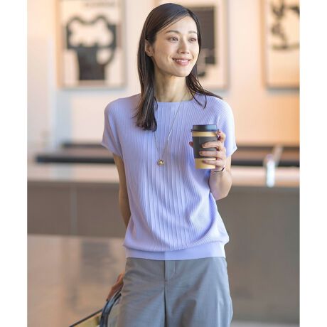 グラデーションガーターのフレンチスリーブニット。今年は編み柄をアップデートし、ニットらしい表現のガーター編みに仕上げました。サイドで細かく切り替えた編み柄は、すっきり見え効果も期待できます。上品な開きのラウンドネックに程良いミニマルシルエットで、スーツのインナーにも単品のカジュアルスタイルにもおすすめ。様々なボトムスと合わせやすいデザインで、着回し力の高い便利アイテムです。カラーは、清潔感のあるホワイト(#001)、パッと目を引くオレンジ(#020)、こなれ感のあるアクセントのライトグリーン(#062)、ベーシックなネイビー(#075)、フェミニンなふじ色(#083)の5色で展開します。