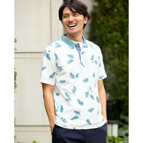 リゾート感漂うリーフプリントが印相的なポロシャツです。吸水速乾性に優れた鹿の子素材を使用しています。さらっとした着心地が特徴です。スラブ糸を使用した独特な表情のある生地にプリントを施し、ナチュラルな雰囲気に仕上げました。