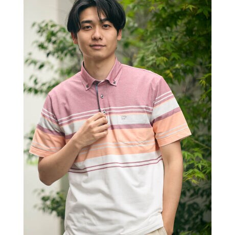 ボタンダウン襟ののボーダーポロシャツです。吸水速乾性に優れた鹿の子生地を使用しています。さらっとした肌触りで着心地のよさが特徴です。大柄パネルボーダーもバーズアイ鹿の子で表現し、優しい配色に仕上げました。父の日のギフトとしてもオススメしやすいアイテムです。