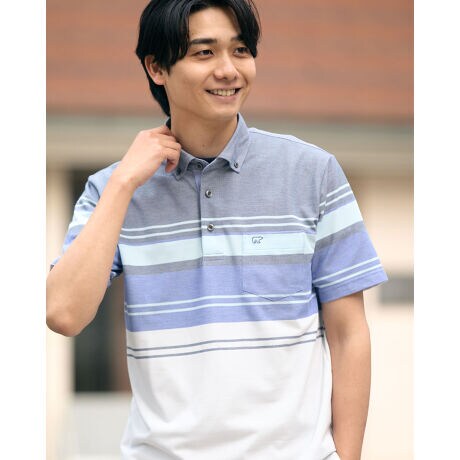 ボタンダウン襟ののボーダーポロシャツです。吸水速乾性に優れた鹿の子生地を使用しています。さらっとした肌触りで着心地のよさが特徴です。大柄パネルボーダーもバーズアイ鹿の子で表現し、優しい配色に仕上げました。父の日のギフトとしてもオススメしやすいアイテムです。