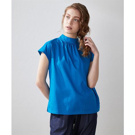 スタンドカラーの下にギャザーを寄せて、知的かつエレガントな表情に仕上げたブラウスです。