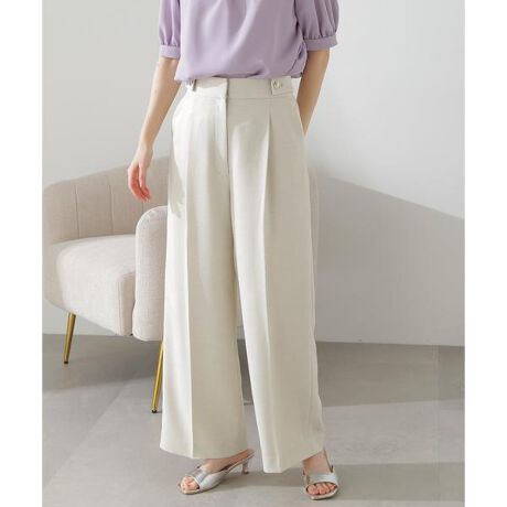 ワイドシルエットにセンタープレスを施したマニッシュなパンツは、ウエスト両わきに付けた釦とタブがアクセントになり、トップスインするとすっきりとした着こなしが完成します。後ろウエストはトップスの収まりが良いゴム仕様。きちんと見えするスラブツイードで仕立てたワイドパンツは、通勤オフィスシーンはもちろん、オフの日もキレイめに着用いただけます。