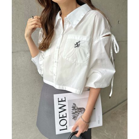 肩スリット エンブロイダリー ショート丈 シャツ ブラウス