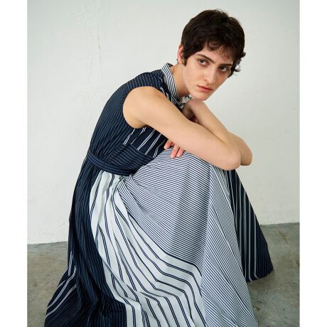 シーズンスタイルにぴったりな清涼感溢れるシャツワンピース。様々なストライプがパッチワークになった、新鮮なオリジナルパターンプリントが特徴の一枚。モードなバンドカラーや端正なプリーツテクニックで、上品な印象に仕上げています。ウエストにはベルトを添え、自然とメリハリの効いたシルエットに。