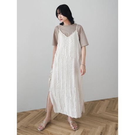 [型番:6A42L0H0500]ふわふわとしたフェザージャガードで華やかな印象に仕上げたキャミワンピース。ゆったり着られるIラインシルエットは、縦感を強調し着こなしもすっきりと見せてくれます。バックのストラップデザインもさりげないポイント。インナー次第でオールシーズン着回しを楽しめるアイテムです。透け感[無し] 裏地[無し] 伸縮性[無し] 光沢感[有り] 生地の厚さ[普通] 付属品[無し] ポケット[有り]前2つ