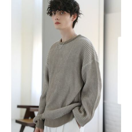 立体的な表情の編地が特長の二重臼ニット。ボリュームのあるリブ仕立てのデザインが特徴。2色の糸を編み込んでいるため、裏面の色との絶妙な配色が着こなしのアクセントになります。ドロップショルダーデザインと余裕を持たせた身幅で、ゆったりしたシルエットが抜け感を作り出してくれる一着。春や秋の1枚着として、また寒い時期はアウターのインナーとしてもおすすめです。